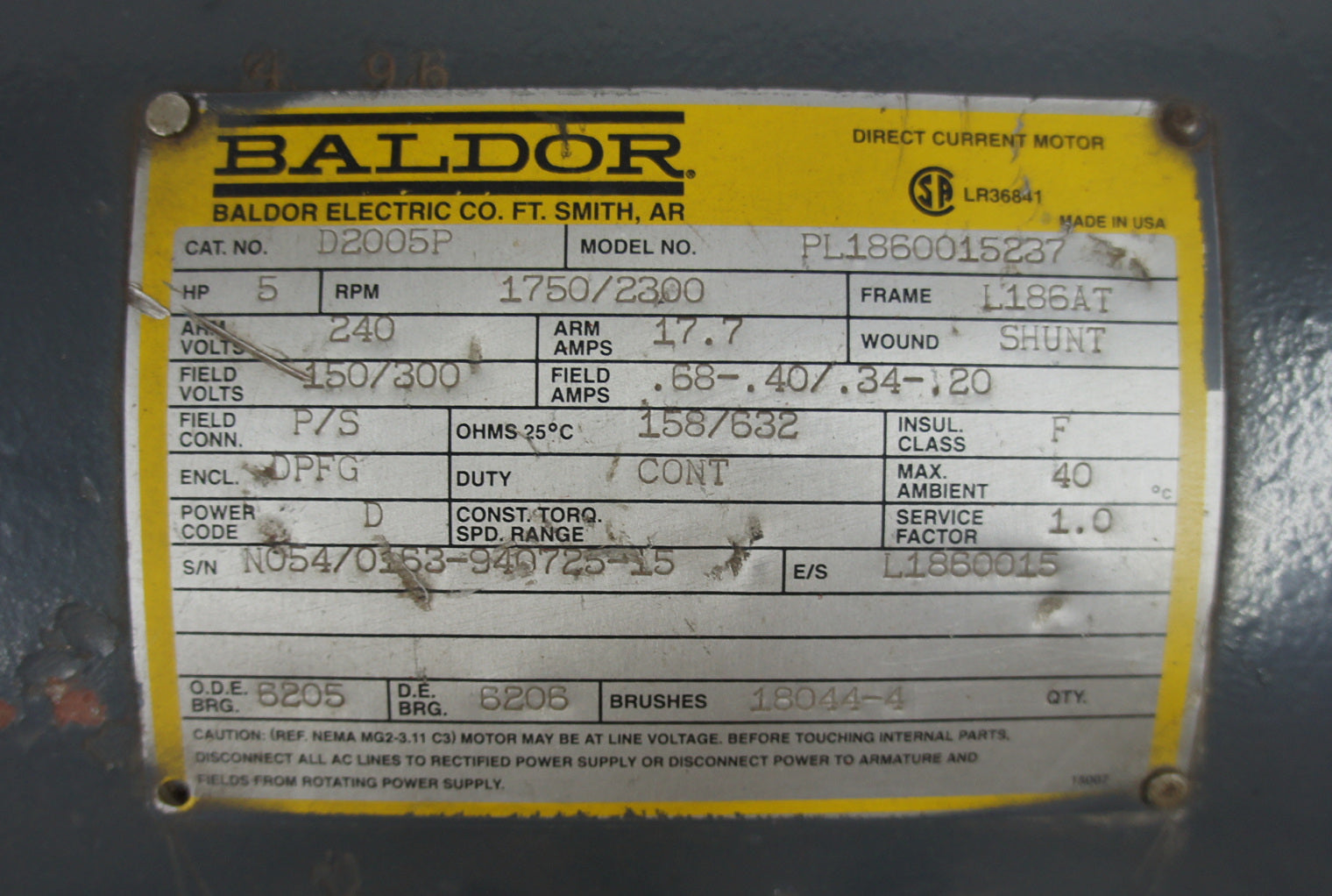 Baldor D2005P 5 HP L186AT 1750 RPM 240 V Direct Current DC Motor (reconditioned)