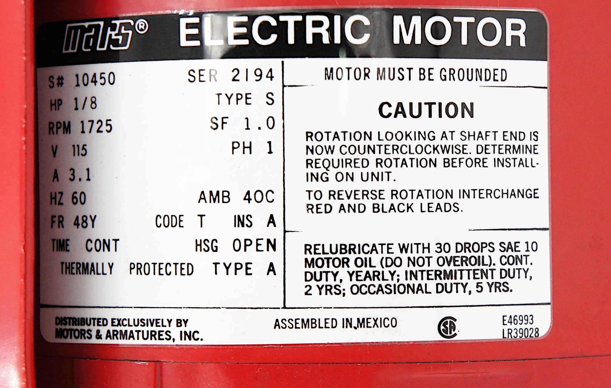 Mars 10450 Circulating Pump Motor 1/8 HP 1725 RPM 48Y