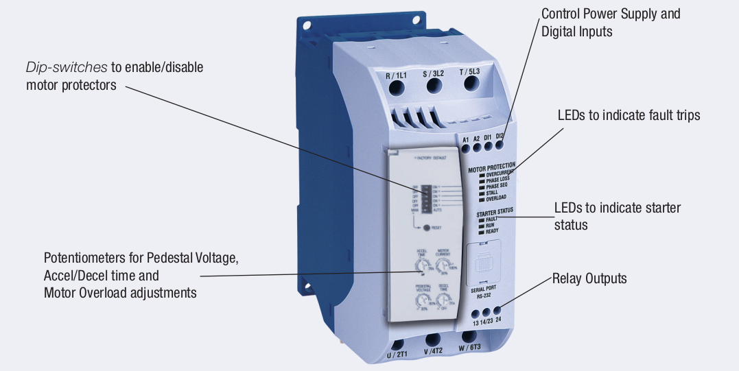 The built-in bypass eliminates the need for an external contactor after the motor reaches full speed, and effectively takes the soft start out of the circuit, while protection monitoring remains in place.